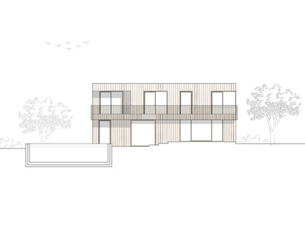 Bei diesem Holzbau sind lediglich die erdberührten Bauteile in Stahlbeton geplant. Das Material Holz findet sich bei fast allen Oberflächen im Innen- und Außenbereich wieder. Die Dachflächen sind als Flachdach ausgebildet, was eine extensive Begrünung und das Aufstellen von PV-Modulen vereinfacht.